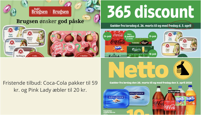 Coop365 tilbyder et udvalg af drikkevarer, herunder Coca-Cola, Fanta, Tuborg Squash eller Carlsberg, Tuborg i pakker af 15-24 x 33 cl til kun 59 kr. pr. pakke. Husk, der er en begrænsning på maks. 6 pakker pr. kunde. Tilbuddet gælder fra torsdag den 26. marts til fredag den 3. april.